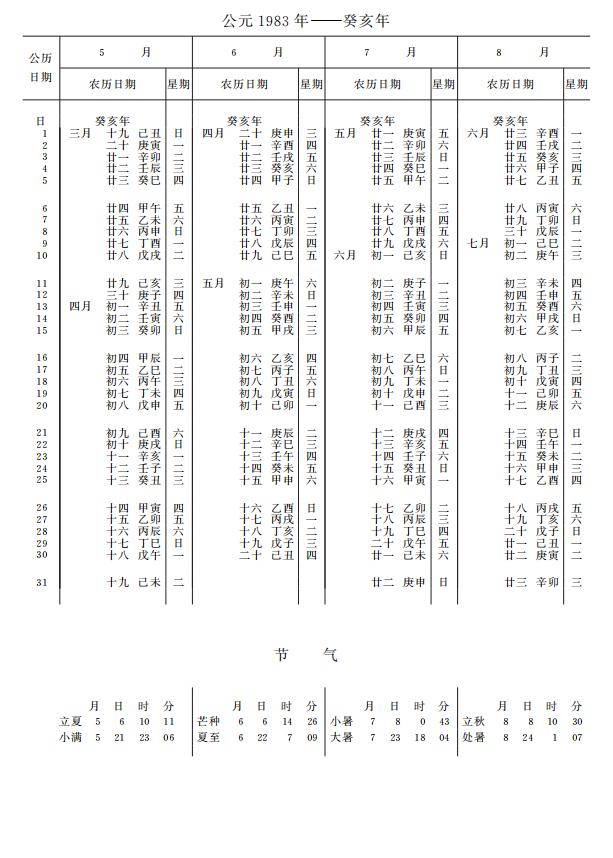 紫金山天文台万年历1983年电子版,新编万年历之1983年(癸亥猪年)