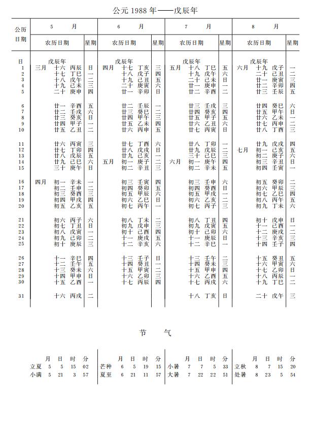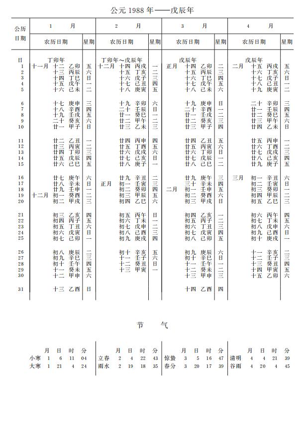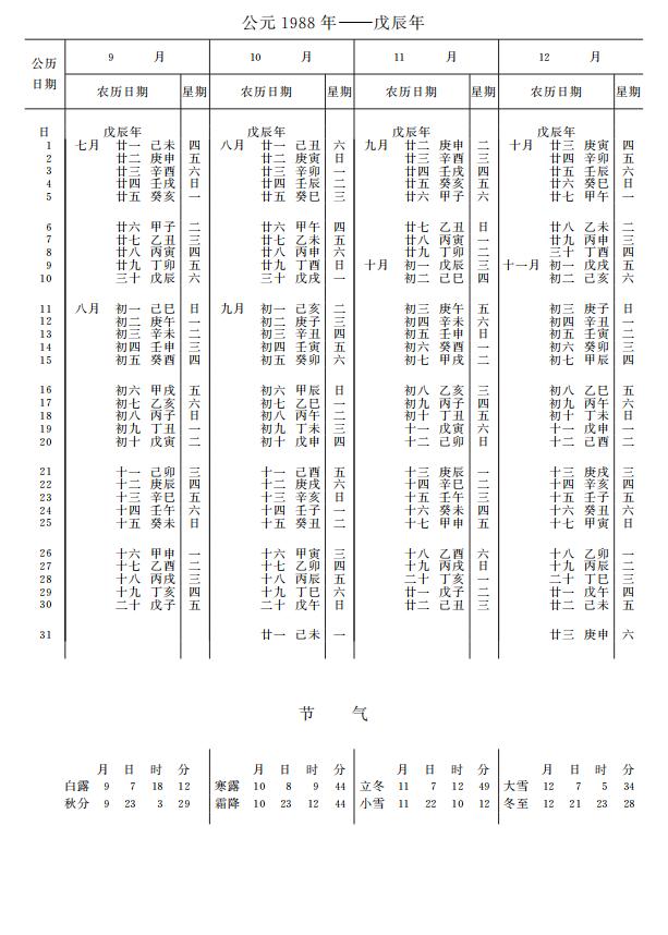 紫金山天文台万年历1988年电子版,新编万年历之1988年(戊辰龙年)