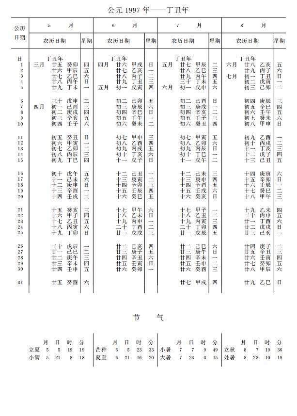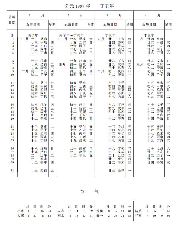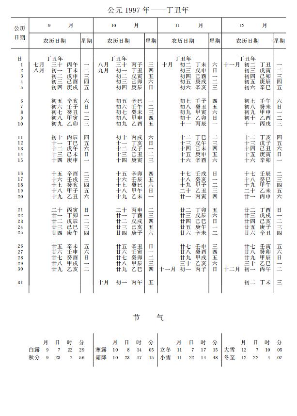 紫金山天文台万年历1997年电子版,新编万年历之1997年(丁丑牛年)