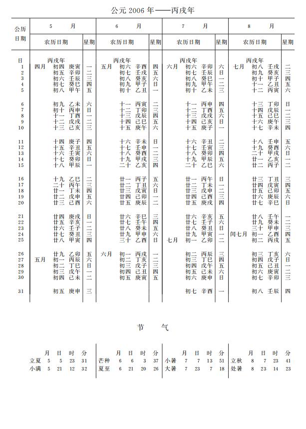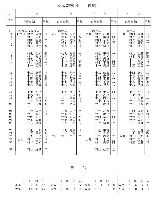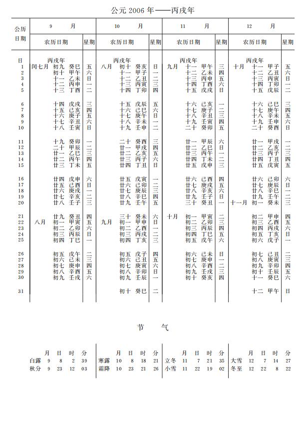 紫金山天文台万年历2006年电子版,新编万年历之2006年(丙戌狗年)