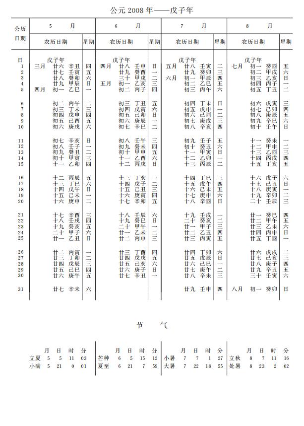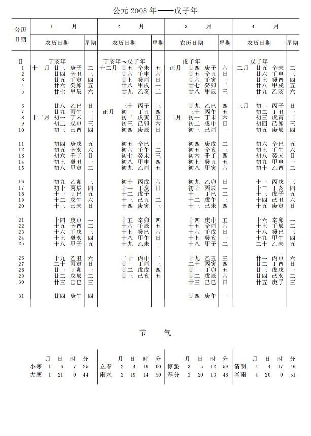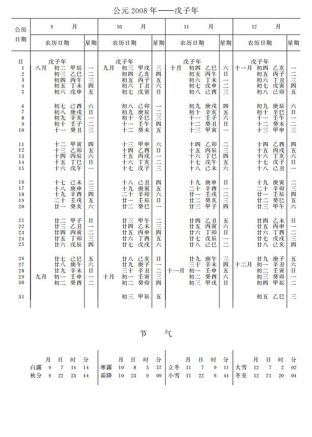 紫金山天文台万年历2008年电子版,新编万年历之2008年(戊子鼠年)