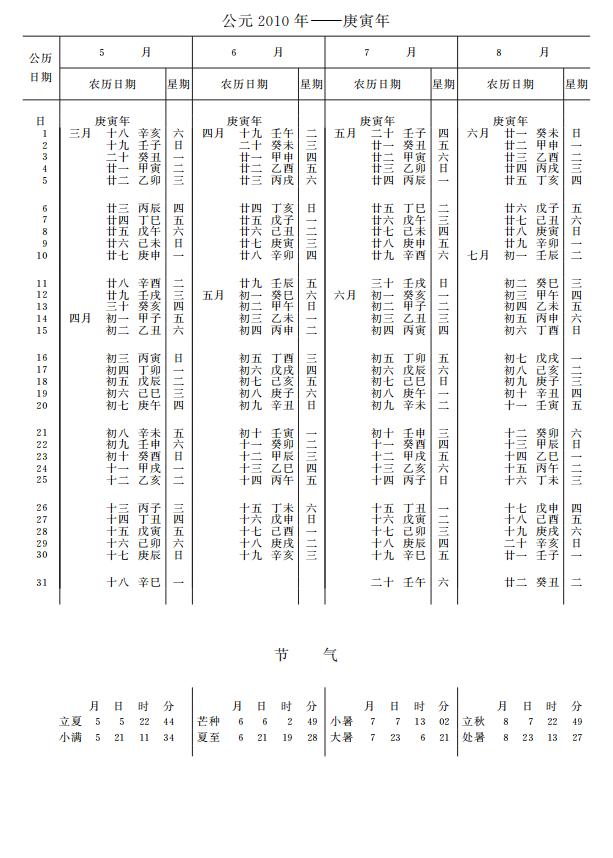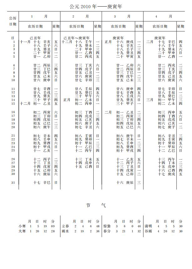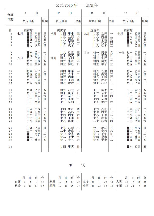 紫金山天文台万年历2010年电子版,新编万年历之2010年(庚寅虎年)