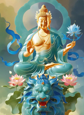 文殊菩萨的形象极具辨识度,通常呈现青年童子相,头戴五髻宝冠,右手持智慧剑,左手持青莲华上置般若经,乘坐青狮,彰显其无上智慧。智慧剑象征斩断烦恼无明的锐利智慧,能破一切执着;青莲华与般若经代表清净无染的般若智慧;青狮则喻示智慧威猛,能摧伏一切愚痴。在佛教义理中,文殊菩萨是诸佛之师,其智慧能照见诸法实相,非单纯的护法神,而是众生开启根本智慧的引导者。对于生肖兔而言,这一形象提醒他们,在发挥温和谨慎特质的同时,需以文殊的智慧剑斩断犹豫,避免因过度谨慎或缺乏自信而错失良机。文殊菩萨的象征意义,核心在于"以智导行",鼓励信者在生活中践行智慧与慈悲。