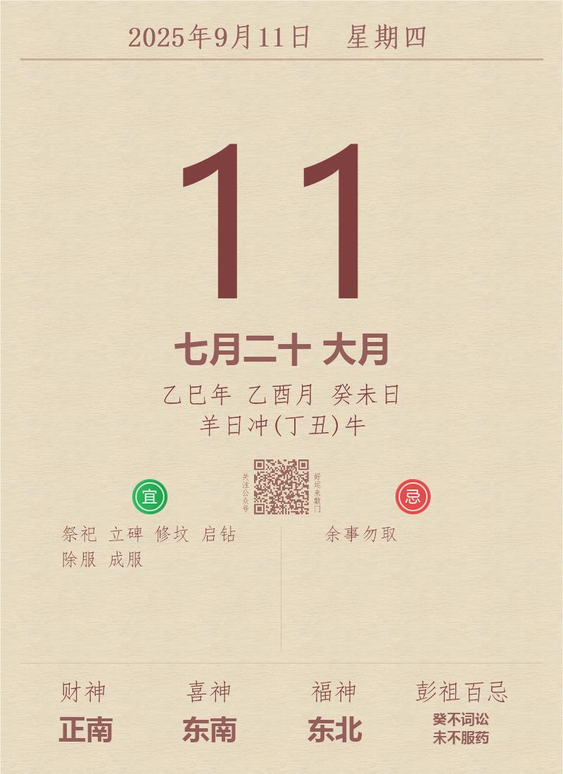 今日老黄历(2025年9月11日):黄历宜忌、财神方位、特吉生肖、打麻将财位