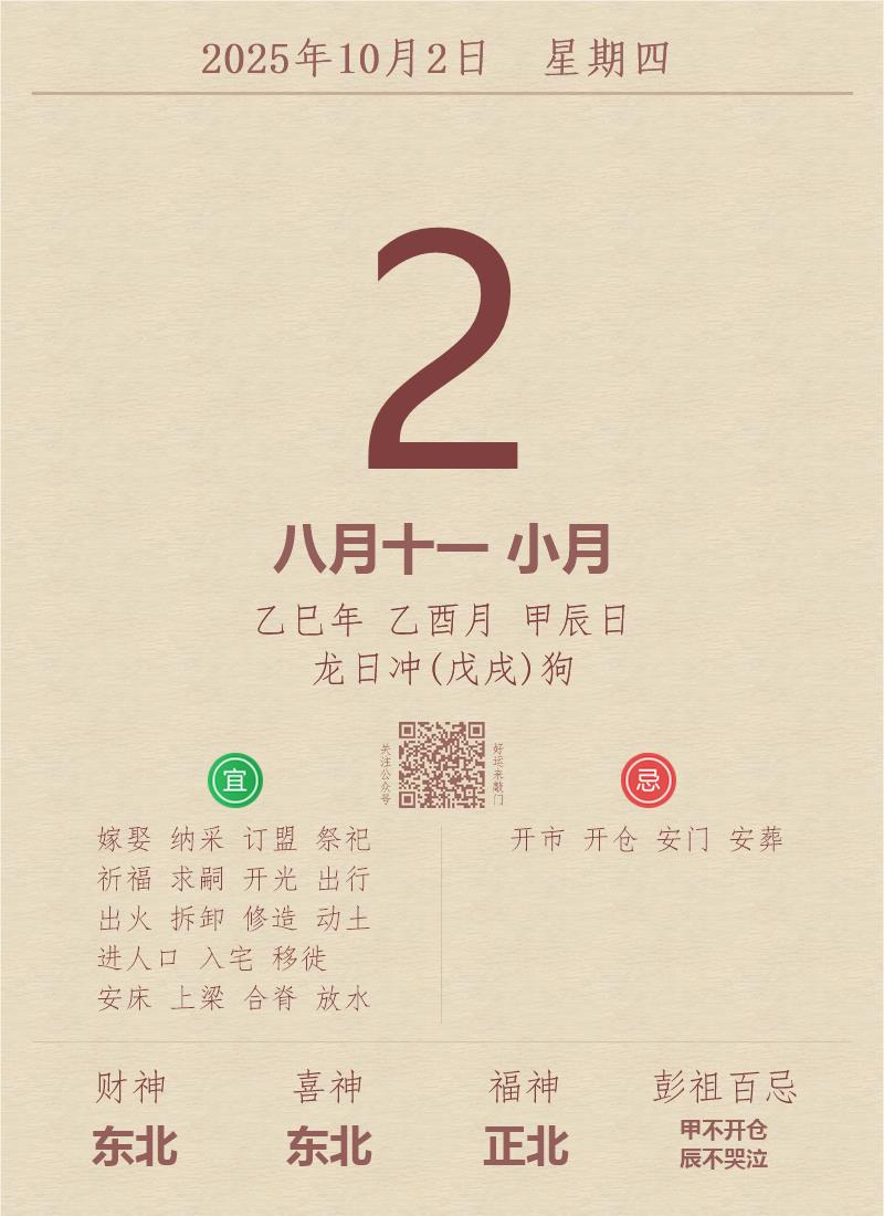 今日老黄历(2025年10月2日):黄历宜忌、财神方位、特吉生肖、打麻将财位