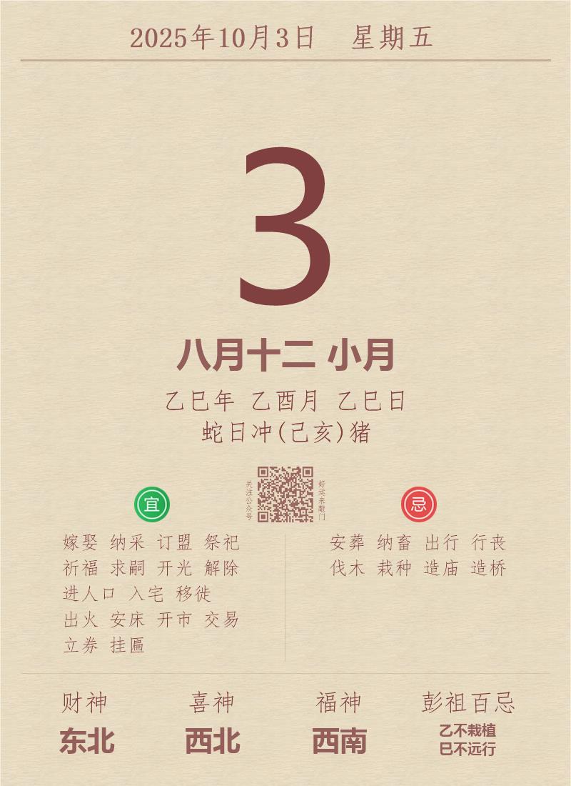 今日老黄历(2025年10月3日):黄历宜忌、财神方位、特吉生肖、打麻将财位