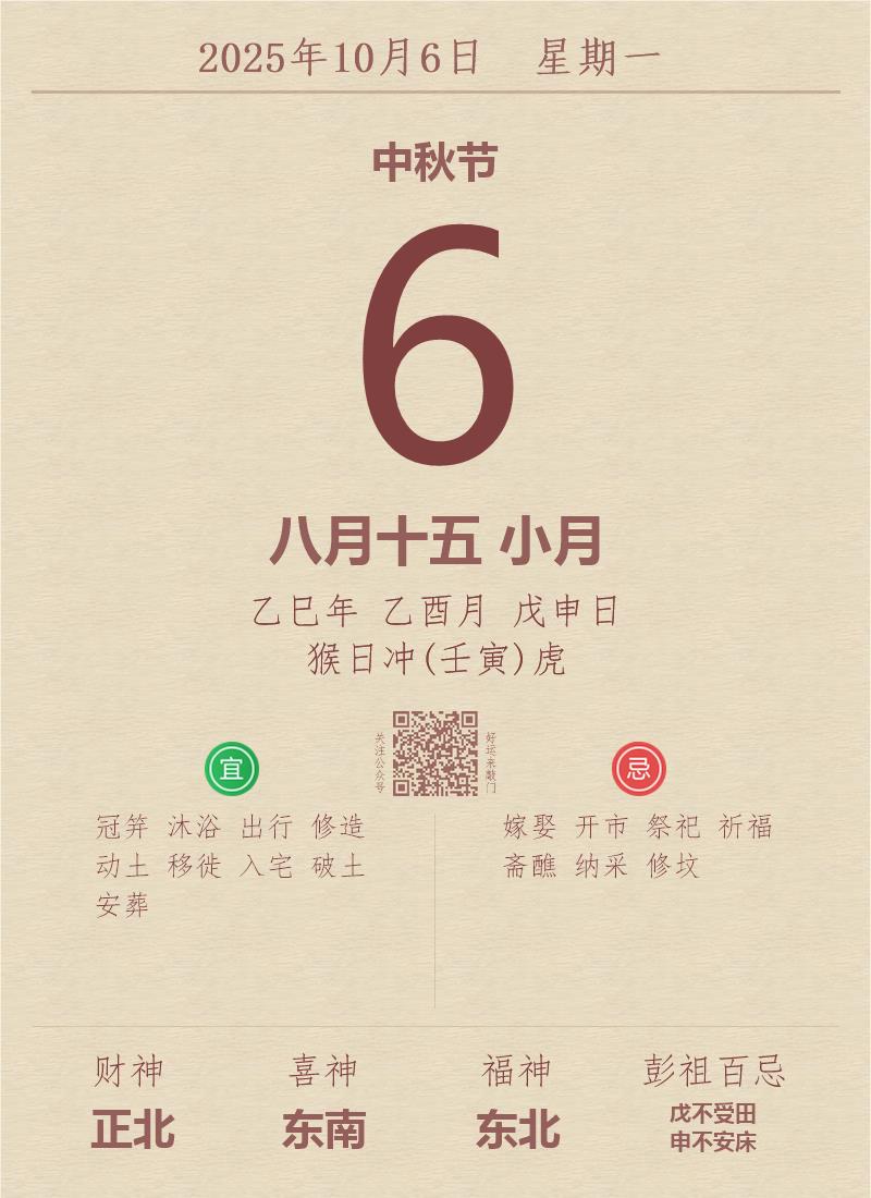 今日老黄历(2025年10月6日):黄历宜忌、财神方位、特吉生肖、打麻将财位