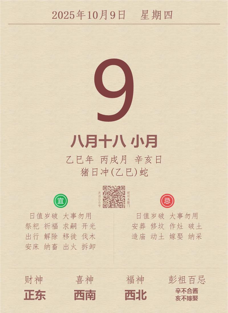 今日老黄历(2025年10月9日):黄历宜忌、财神方位、特吉生肖、打麻将财位