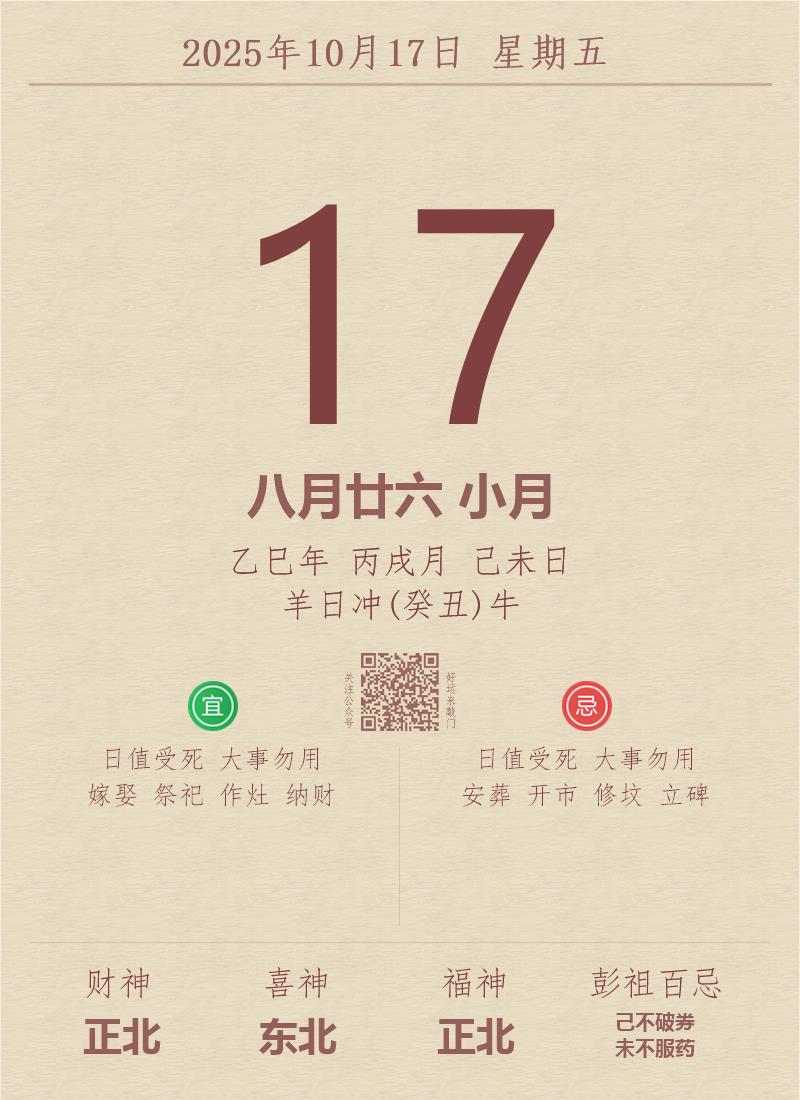 今日老黄历(2025年10月17日):黄历宜忌、财神方位、特吉生肖、打麻将财位