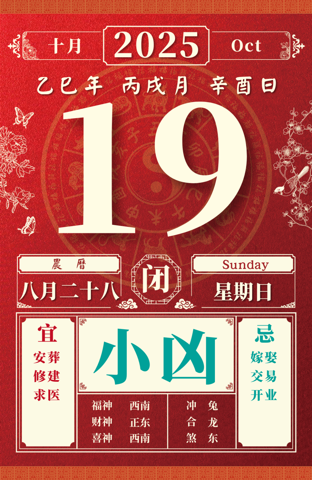 今日老黄历(2025年10月19日):黄历宜忌、财神方位、特吉生肖、打麻将财位
