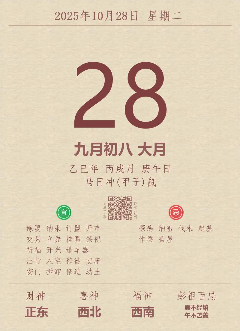 今日老黄历(2025年10月28日):黄历宜忌、财神方位、特吉生肖、打麻将财位