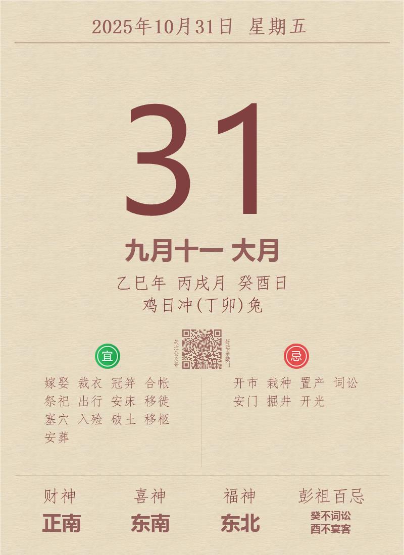 今日老黄历(2025年10月31日):黄历宜忌、财神方位、特吉生肖、打麻将财位