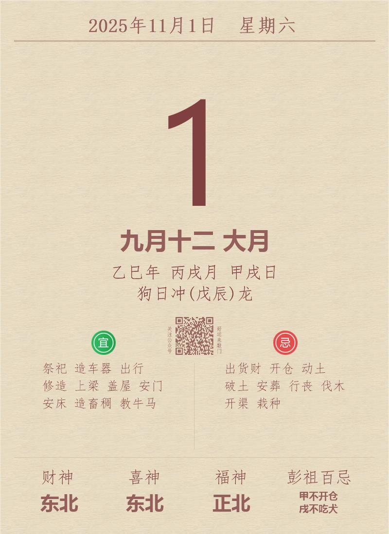 今日老黄历(2025年11月1日):黄历宜忌、财神方位、特吉生肖、打麻将财位