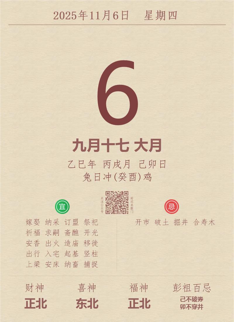 今日老黄历(2025年11月6日):黄历宜忌、财神方位、特吉生肖、打麻将财位