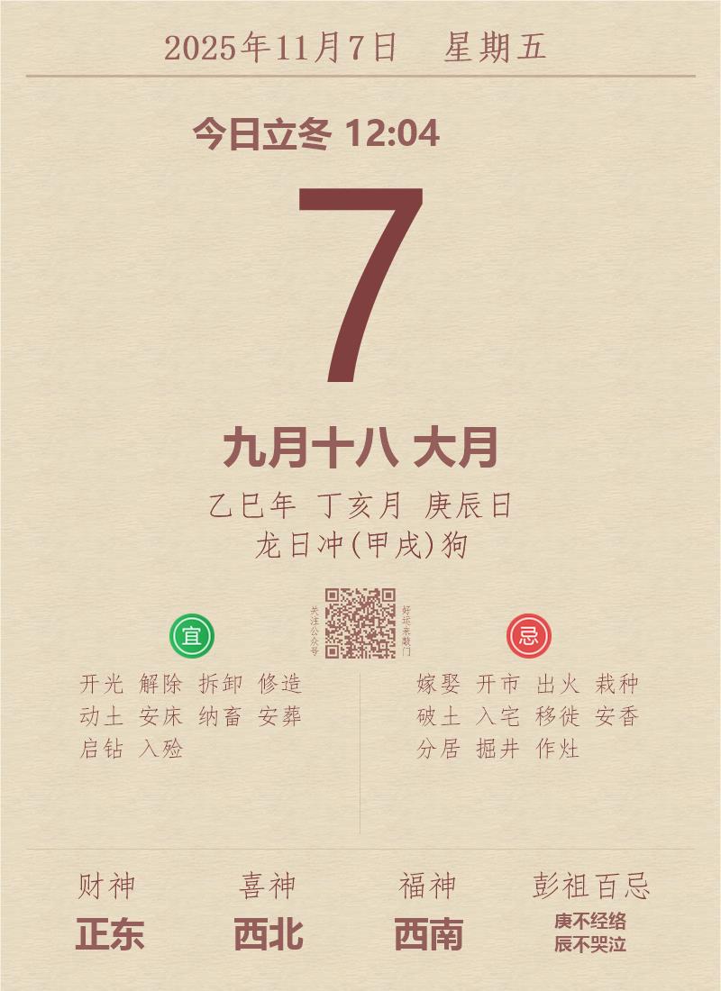 今日老黄历(2025年11月7日):黄历宜忌、财神方位、特吉生肖、打麻将财位