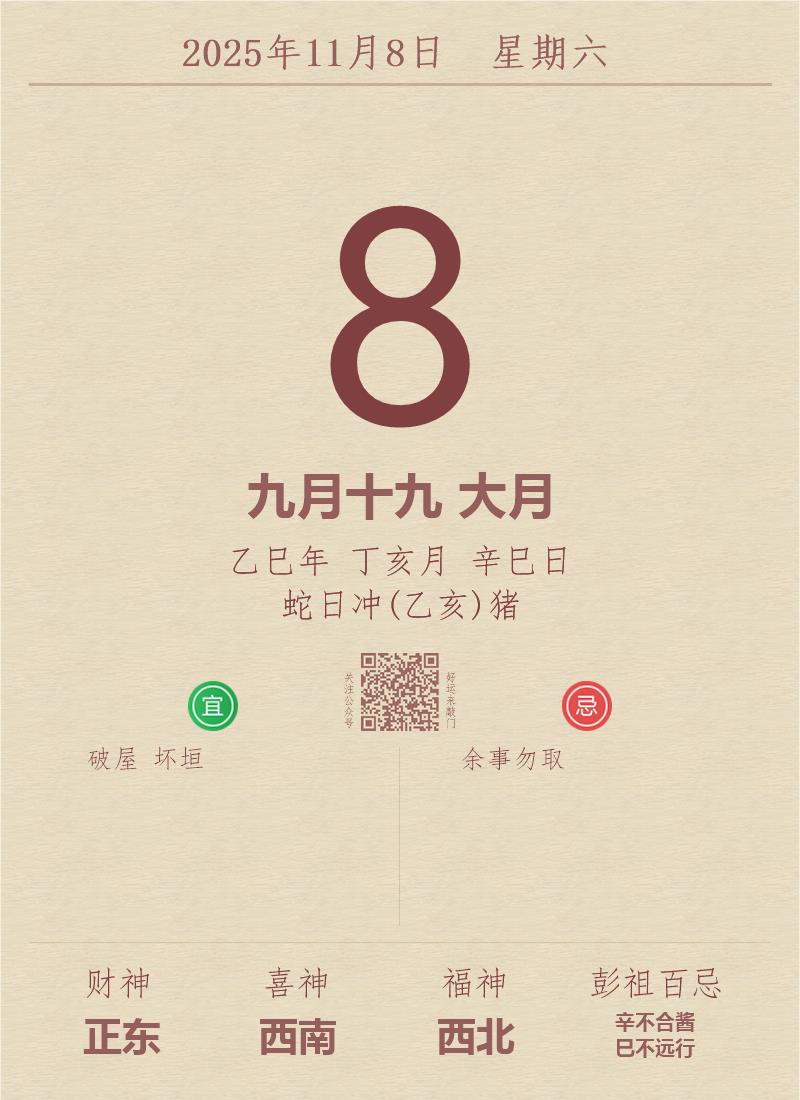 今日老黄历(2025年11月8日):黄历宜忌、财神方位、特吉生肖、打麻将财位