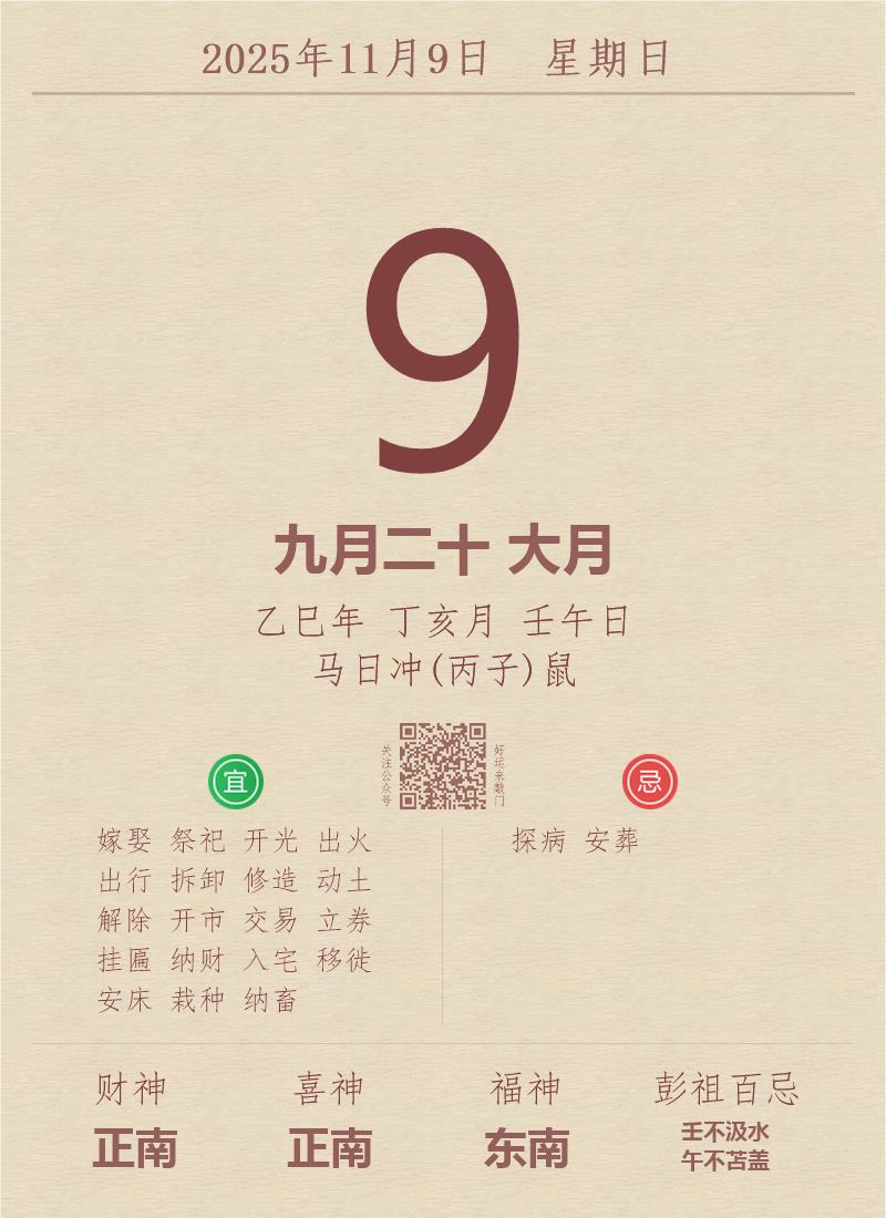 今日老黄历(2025年11月9日):黄历宜忌、财神方位、特吉生肖、打麻将财位