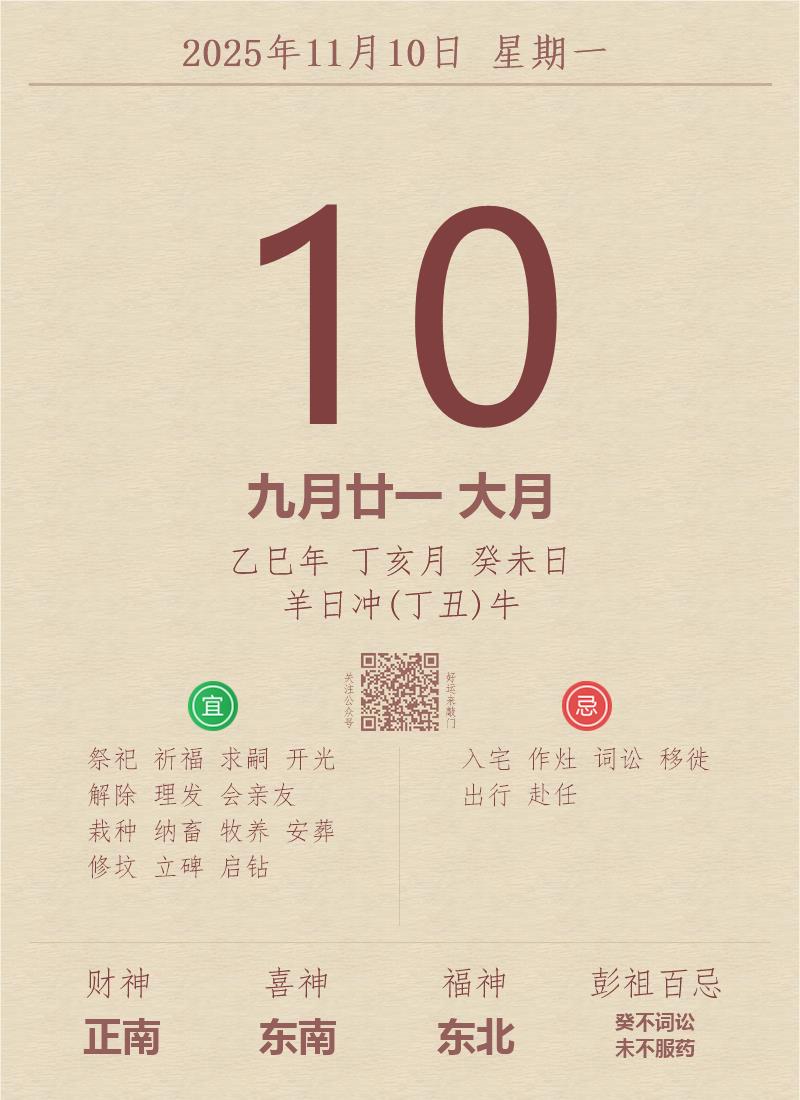今日老黄历(2025年11月10日):黄历宜忌、财神方位、特吉生肖、打麻将财位