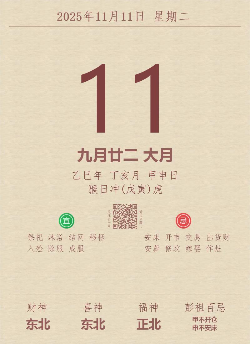 今日老黄历(2025年11月11日):黄历宜忌、财神方位、特吉生肖、打麻将财位
