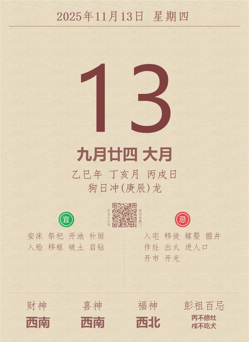 今日老黄历(2025年11月13日):黄历宜忌、财神方位、特吉生肖、打麻将财位