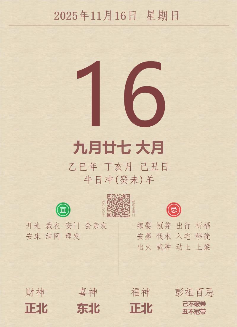 今日老黄历(2025年11月16日):黄历宜忌、财神方位、特吉生肖、打麻将财位