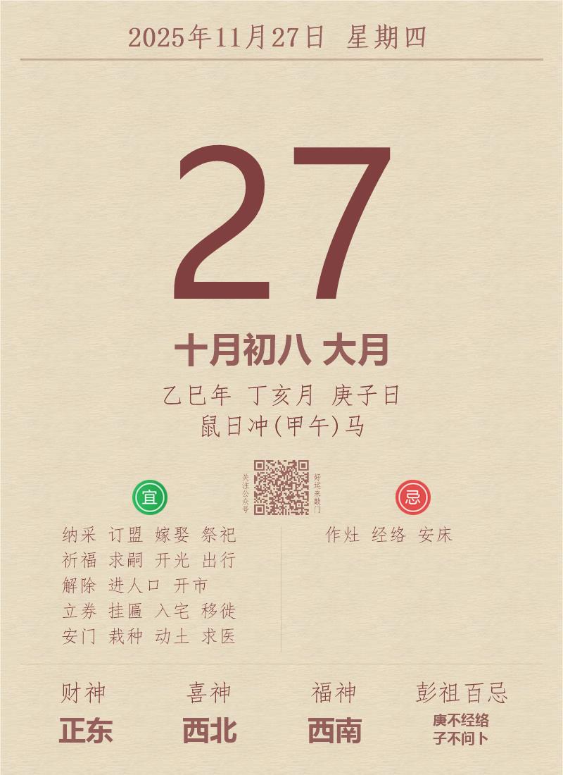 今日老黄历(2025年11月27日):黄历宜忌、财神方位、特吉生肖、打麻将财位