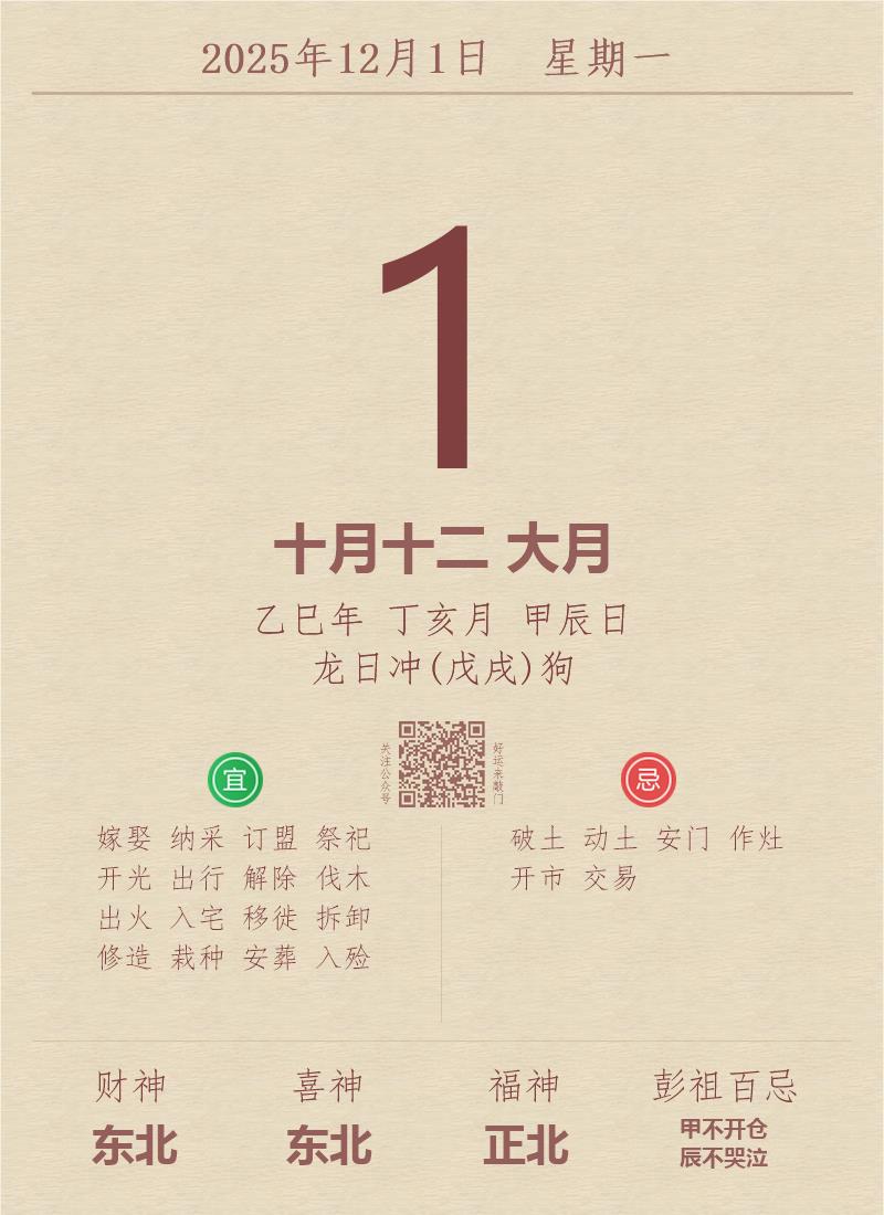 今日老黄历(2025年12月1日):黄历宜忌、财神方位、特吉生肖、打麻将财位