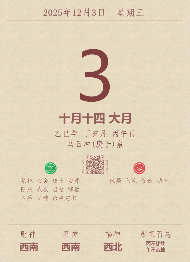 今日老黄历(2025年12月3日):黄历宜忌、财神方位、特吉生肖、打麻将财位
