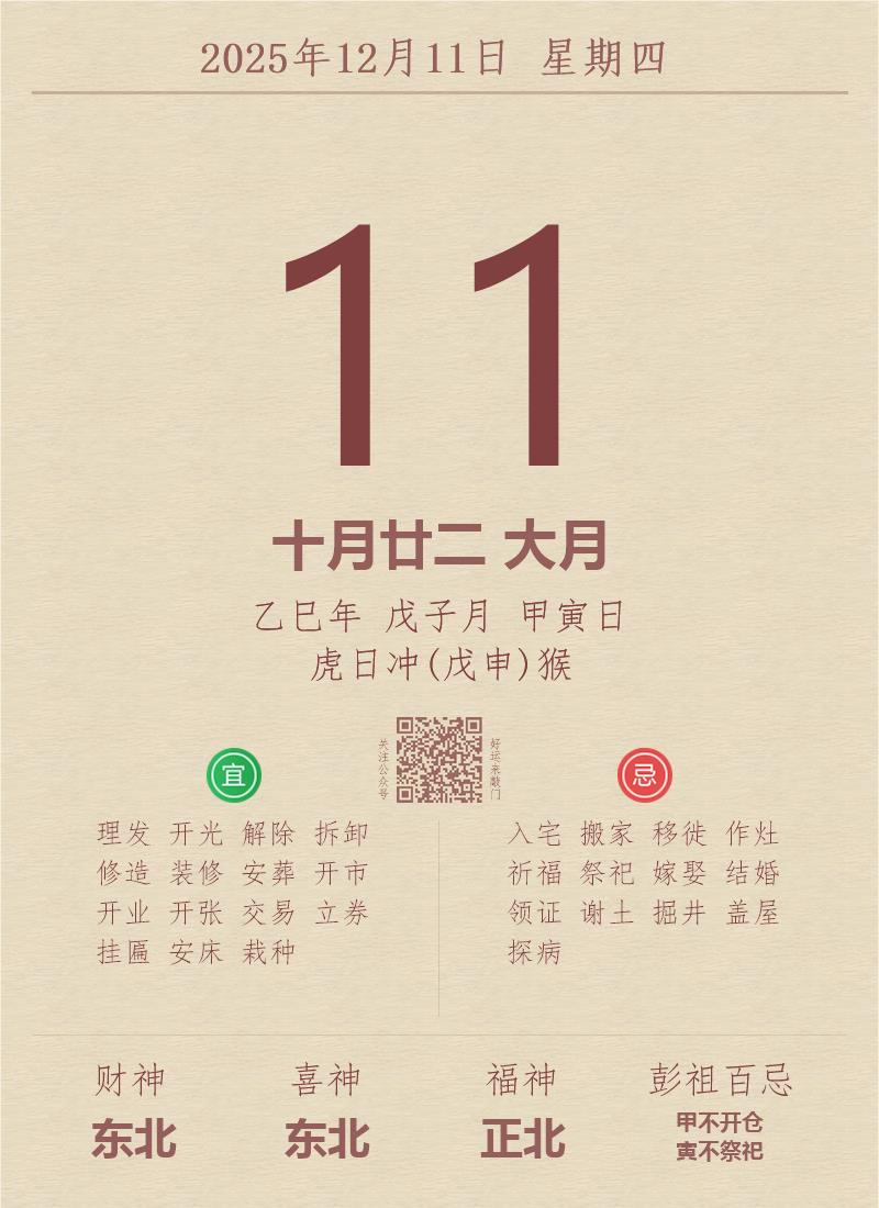 今日老黄历(2025年12月11日):黄历宜忌、财神方位、特吉生肖、打麻将财位
