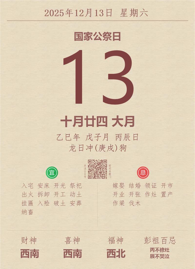 今日老黄历(2025年12月13日):黄历宜忌、财神方位、特吉生肖、打麻将财位