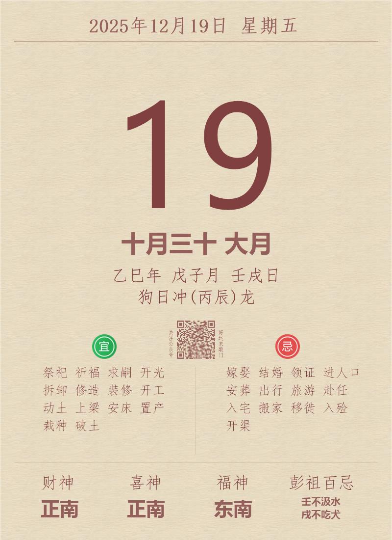 今日老黄历(2025年12月19日):黄历宜忌、财神方位、特吉生肖、打麻将财位