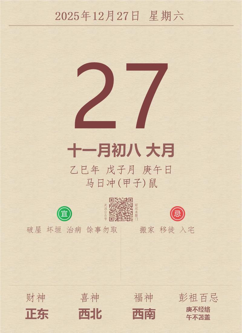 今日老黄历(2025年12月27日):黄历宜忌、财神方位、特吉生肖、打麻将财位