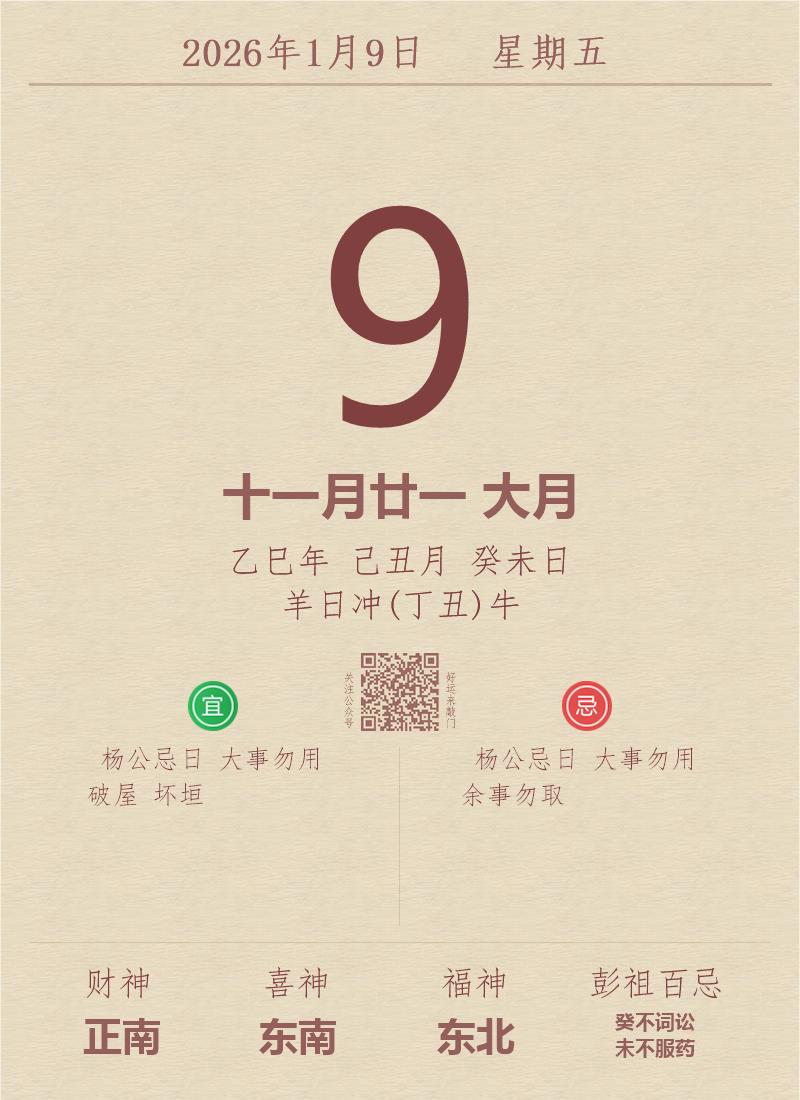 今日老黄历(2026年1月9日):黄历宜忌、财神方位、特吉生肖、打麻将财位