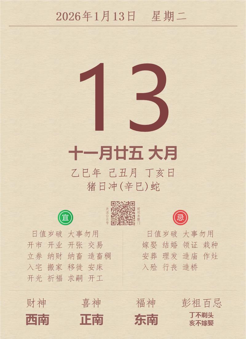 今日老黄历(2026年1月13日):黄历宜忌、财神方位、特吉生肖、打麻将财位