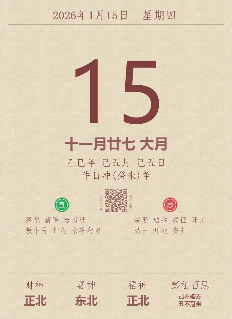 今日老黄历(2026年1月15日):黄历宜忌、财神方位、特吉生肖、打麻将财位
