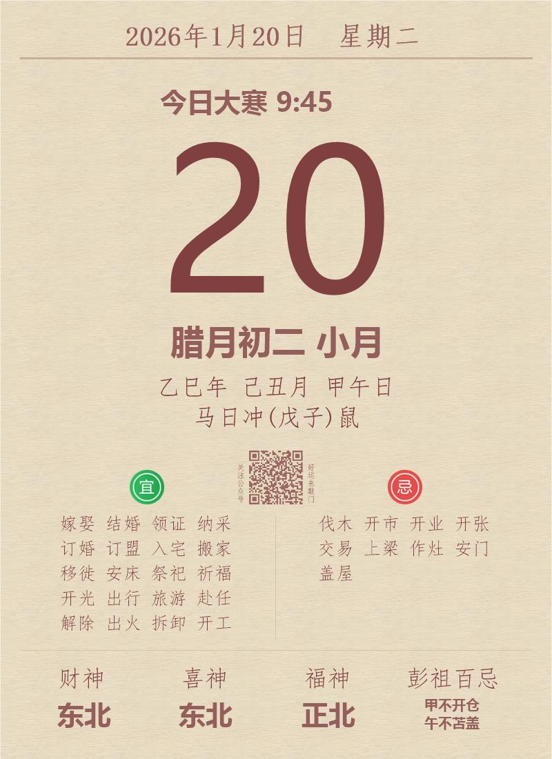今日老黄历(2026年1月20日):黄历宜忌、财神方位、特吉生肖、打麻将财位