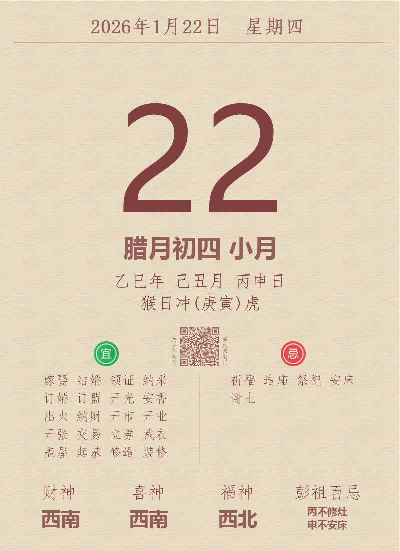 今日老黄历(2026年1月22日):黄历宜忌、财神方位、特吉生肖、打麻将财位