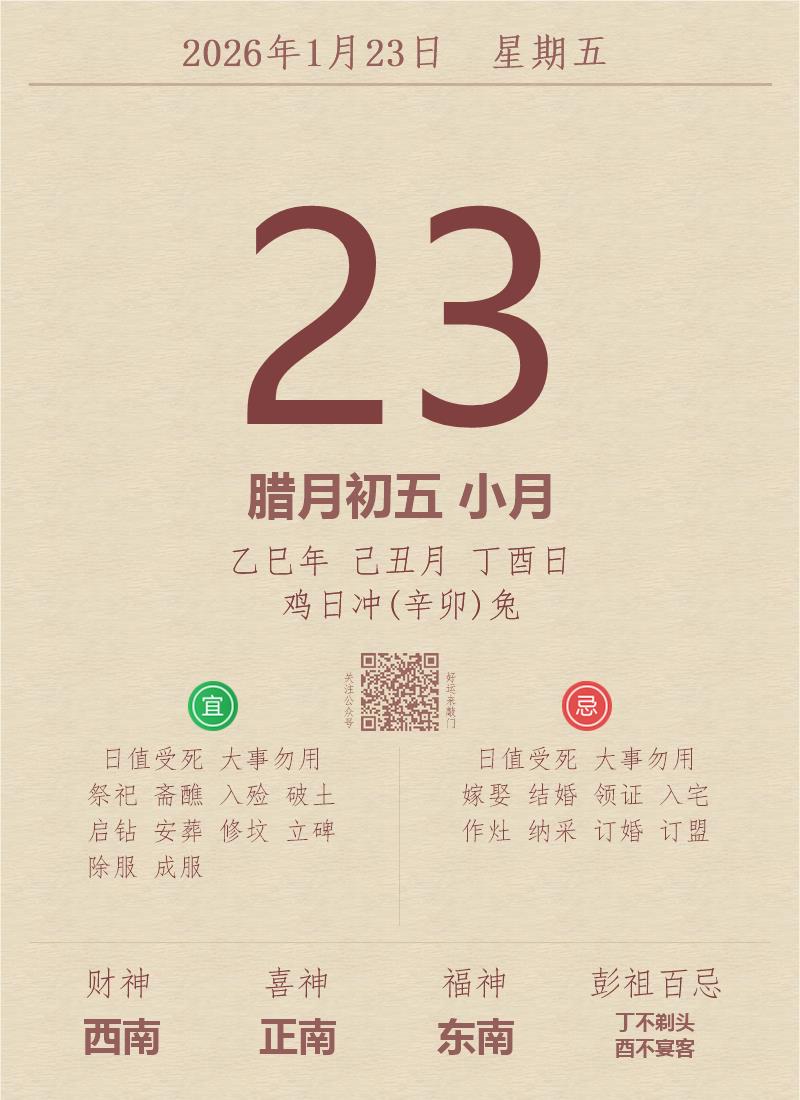今日老黄历(2026年1月23日):黄历宜忌、财神方位、特吉生肖、打麻将财位