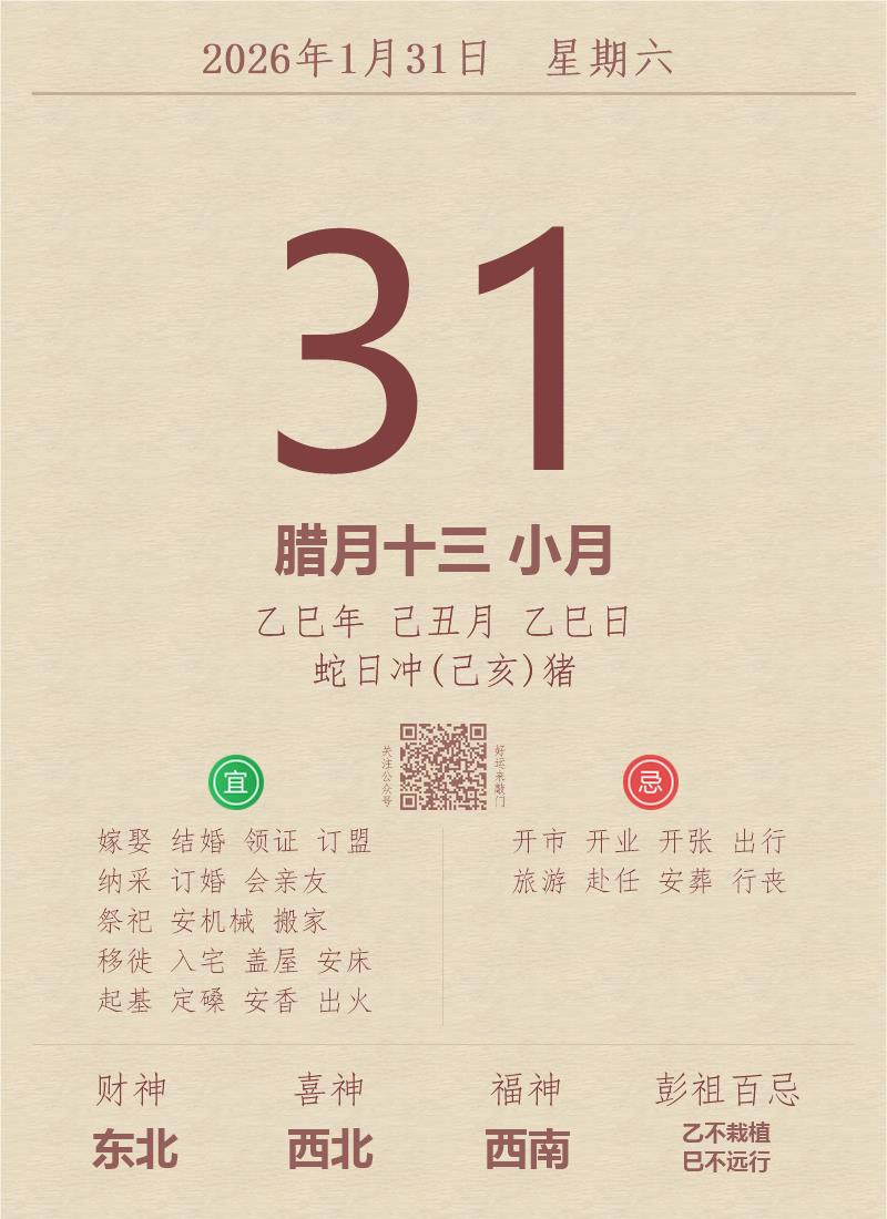 今日老黄历(2026年1月31日):黄历宜忌、财神方位、特吉生肖、打麻将财位