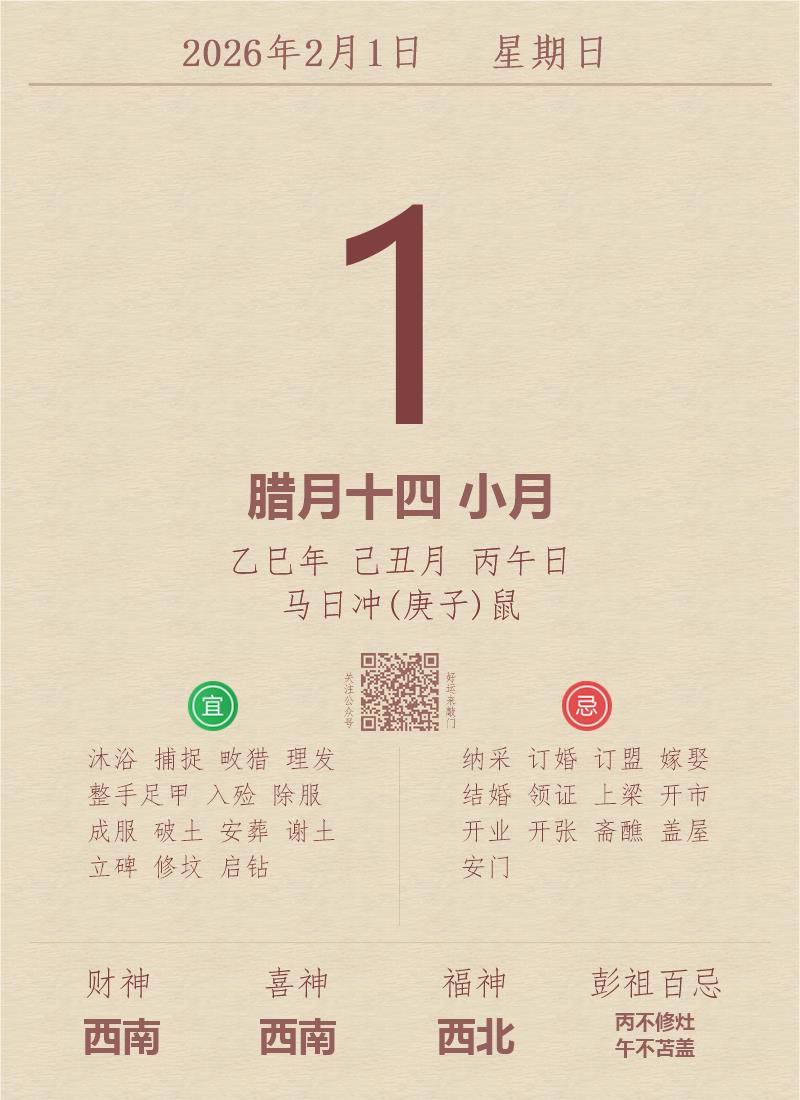 今日老黄历(2026年2月1日):黄历宜忌、财神方位、特吉生肖、打麻将财位
