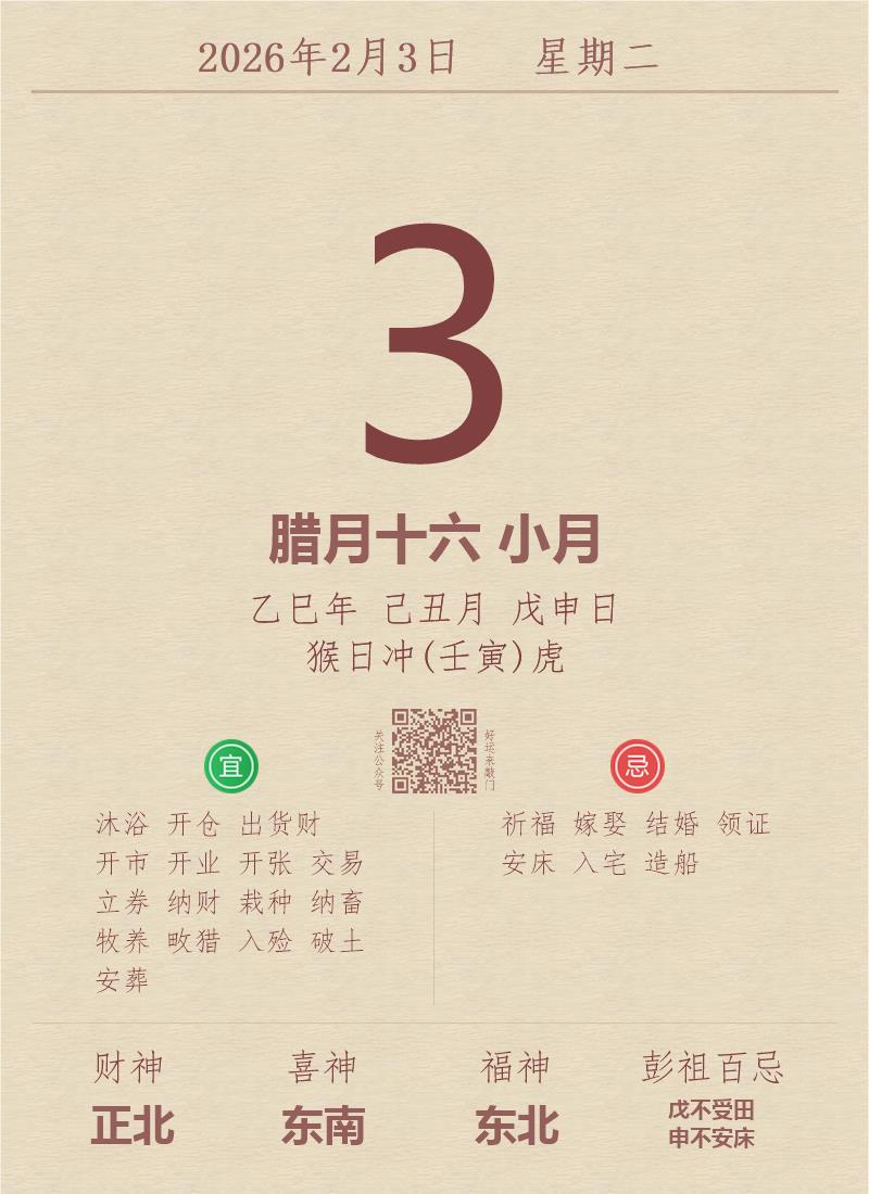 今日老黄历(2026年2月3日):黄历宜忌、财神方位、特吉生肖、打麻将财位