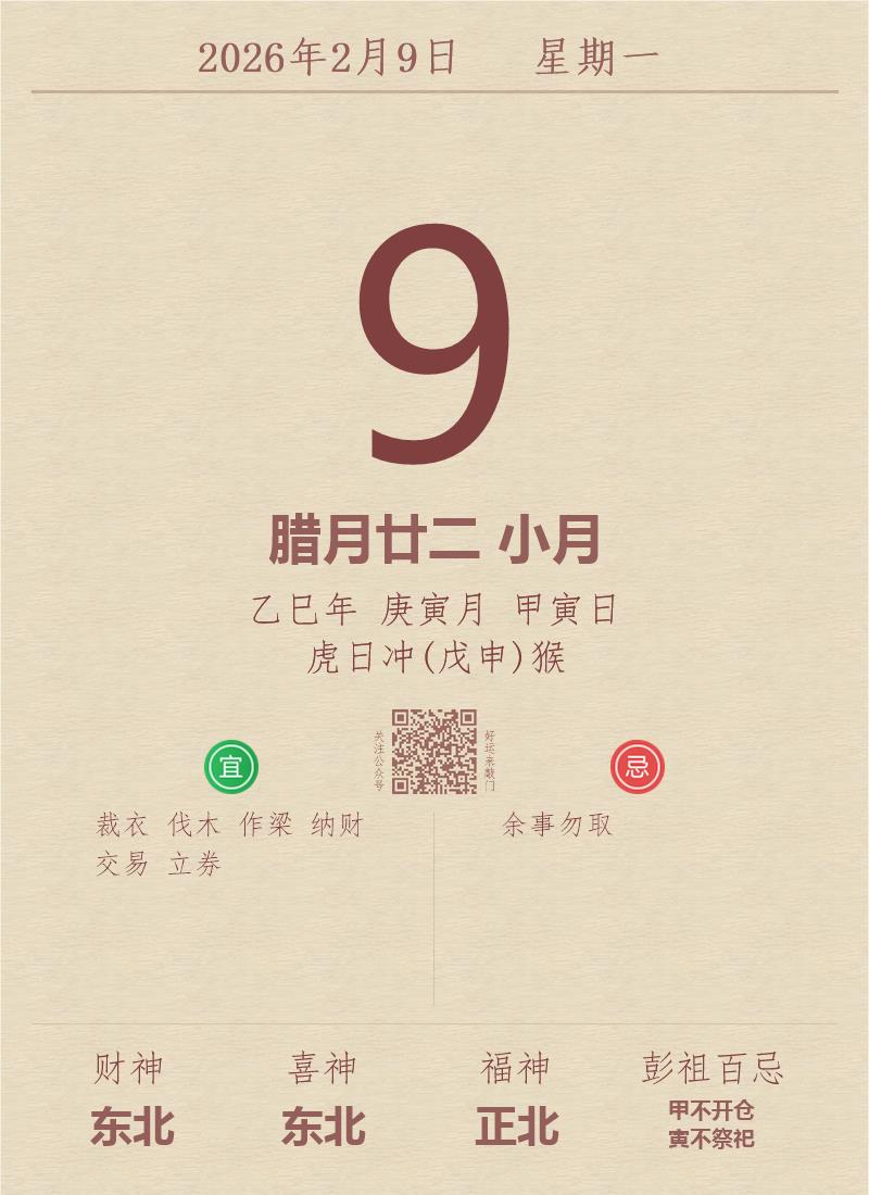 今日老黄历(2026年2月9日):黄历宜忌、财神方位、特吉生肖、打麻将财位