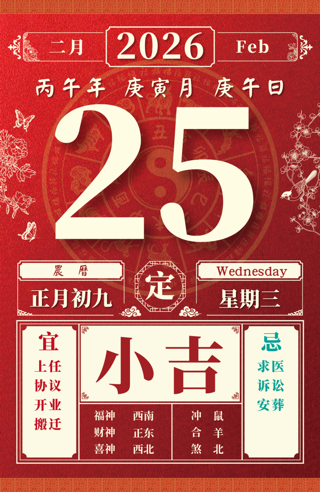 今日老黄历(2026年2月24日):黄历宜忌、财神方位、特吉生肖、打麻将财位