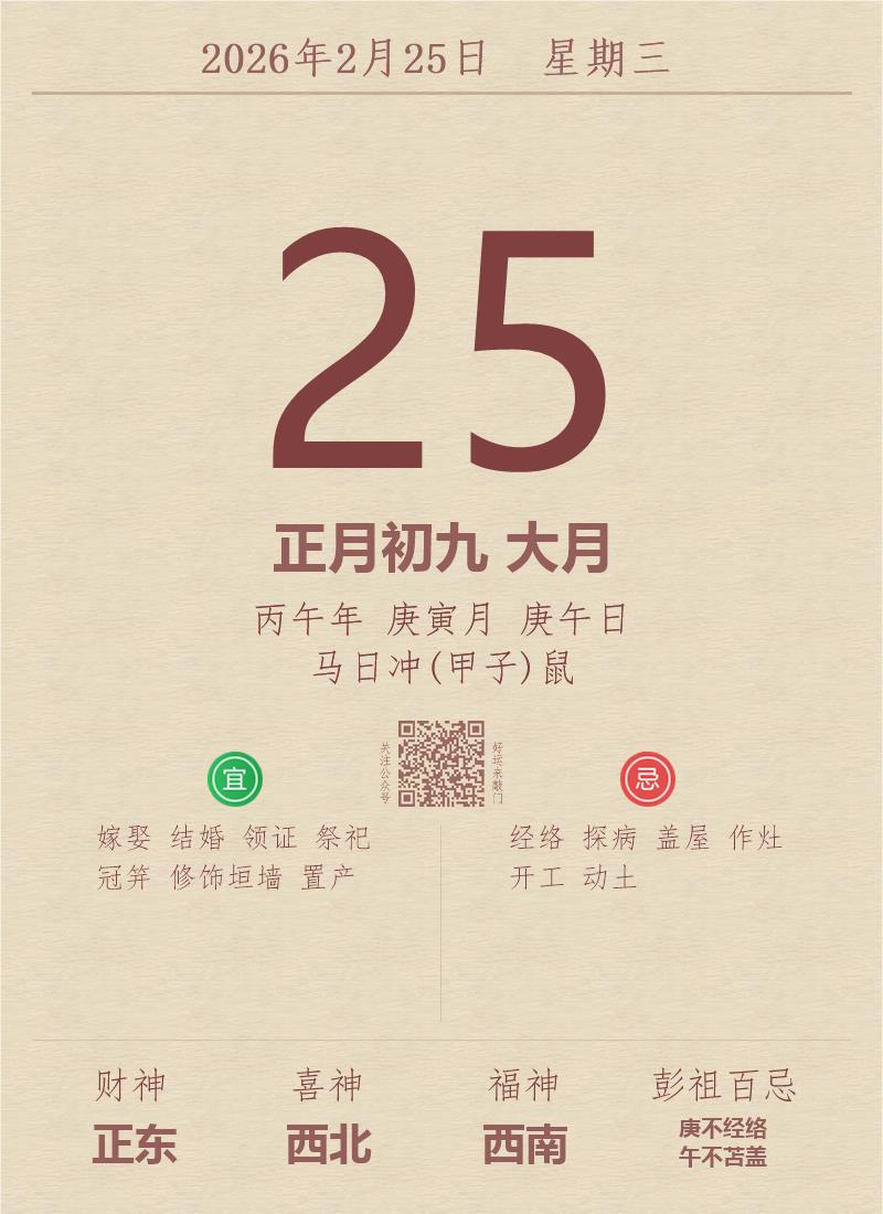 今日老黄历(2026年2月25日):黄历宜忌、财神方位、特吉生肖、打麻将财位