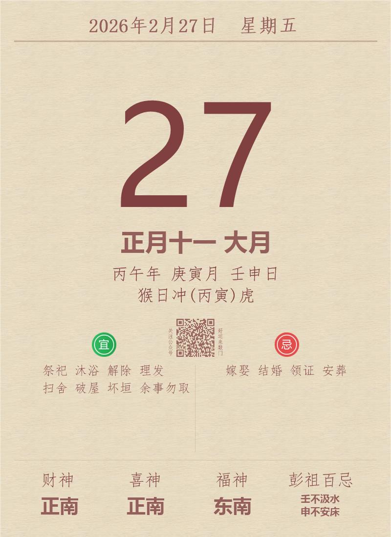 今日老黄历(2026年2月27日):黄历宜忌、财神方位、特吉生肖、打麻将财位