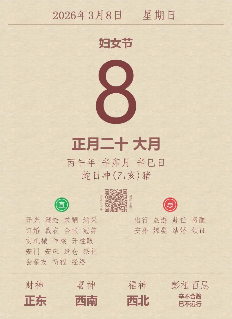今日老黄历(2026年3月8日):黄历宜忌、财神方位、特吉生肖、打麻将财位