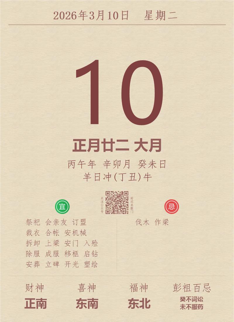 今日老黄历(2026年3月10日):黄历宜忌、财神方位、特吉生肖、打麻将财位