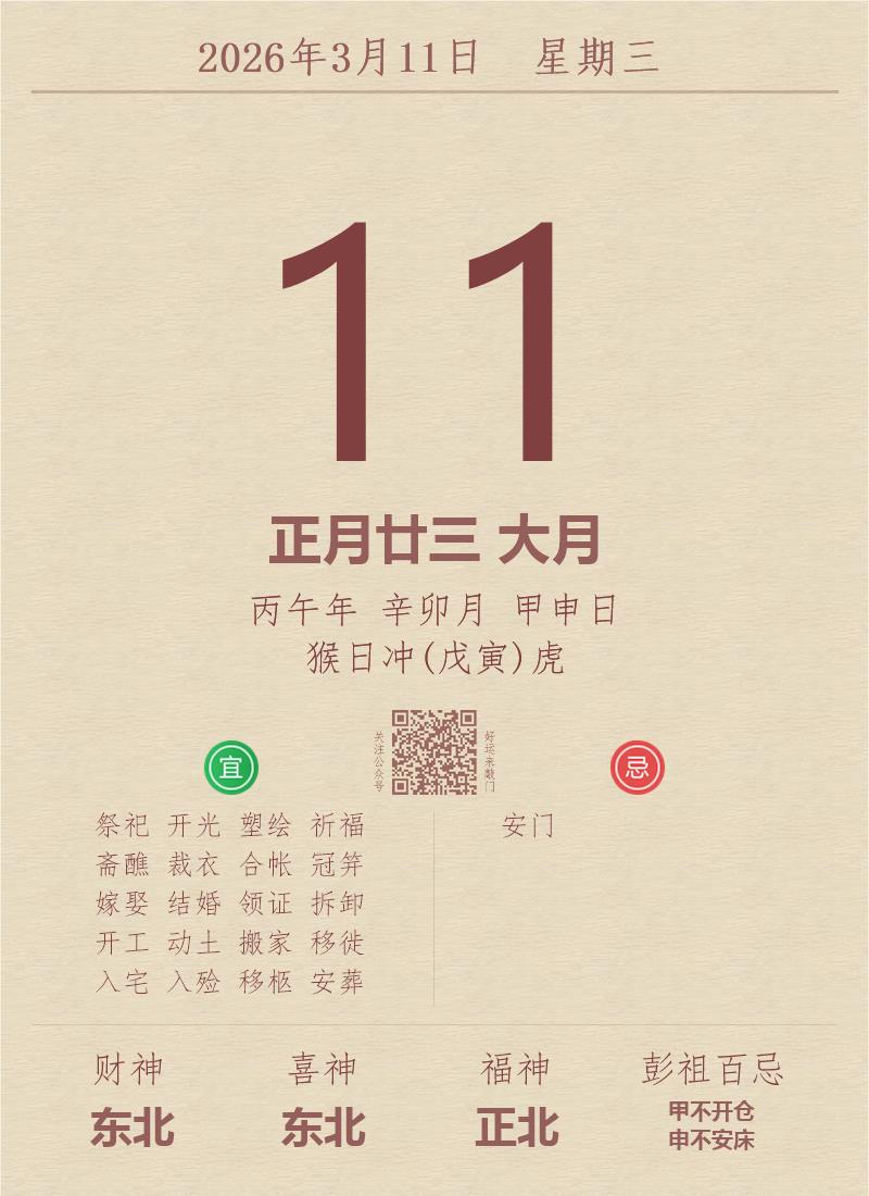今日老黄历(2026年3月11日):黄历宜忌、财神方位、特吉生肖、打麻将财位