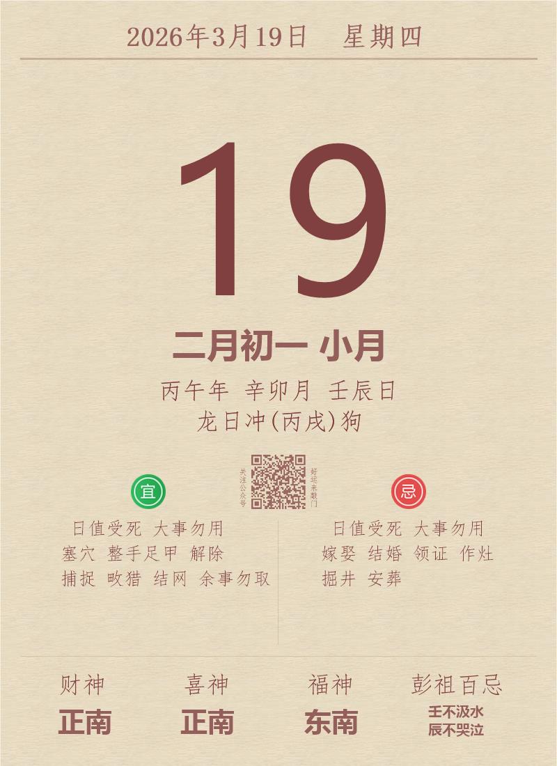 今日老黄历(2026年3月19日):黄历宜忌、财神方位、特吉生肖、打麻将财位