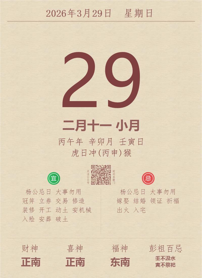 今日老黄历(2026年3月29日):黄历宜忌、财神方位、特吉生肖、打麻将财位